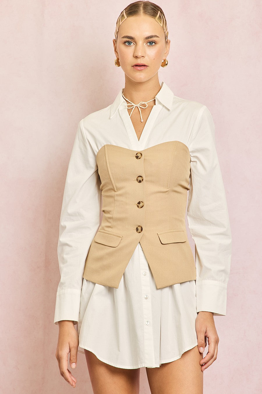 Button down front, front faux flap pockets, strapless